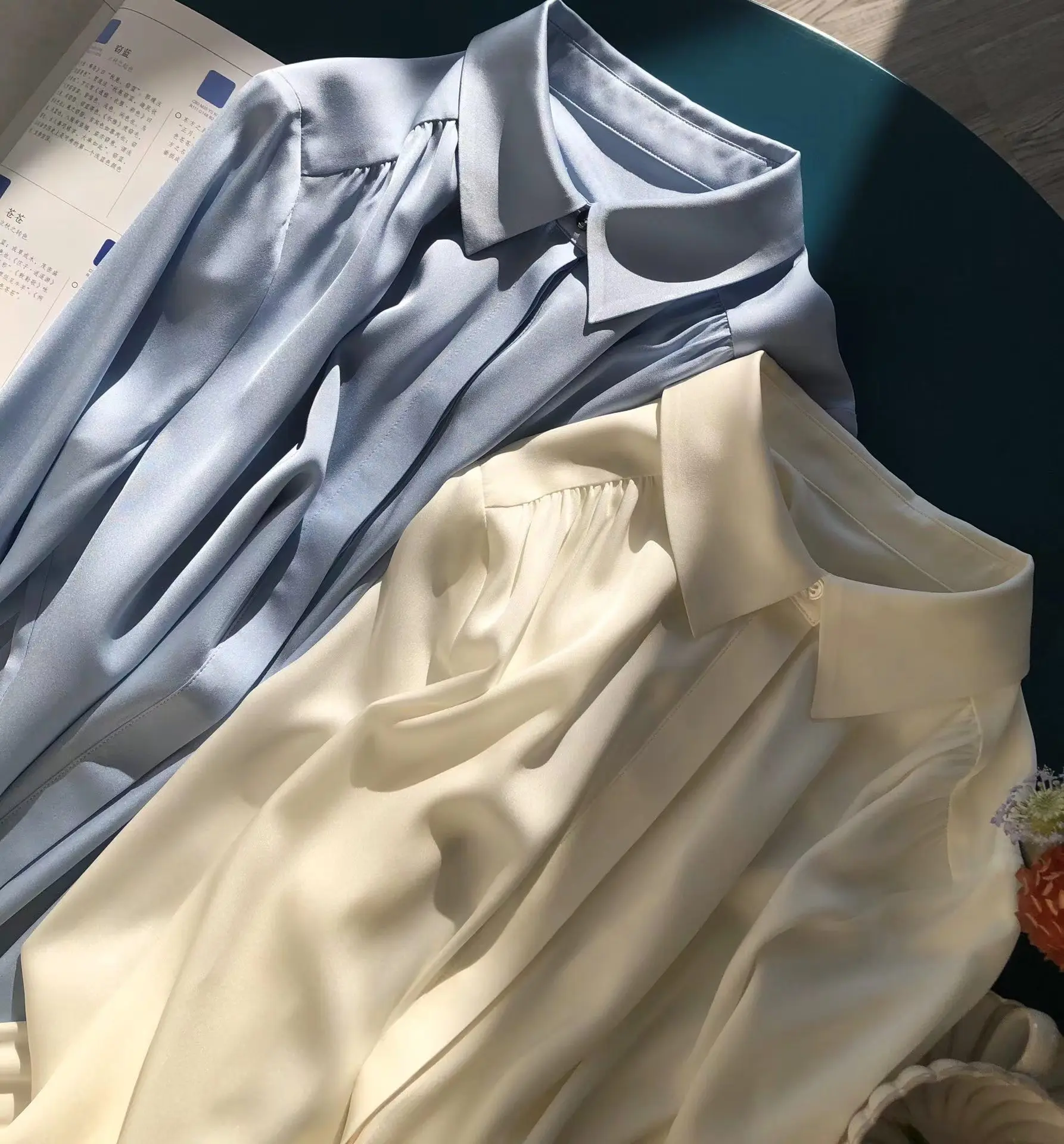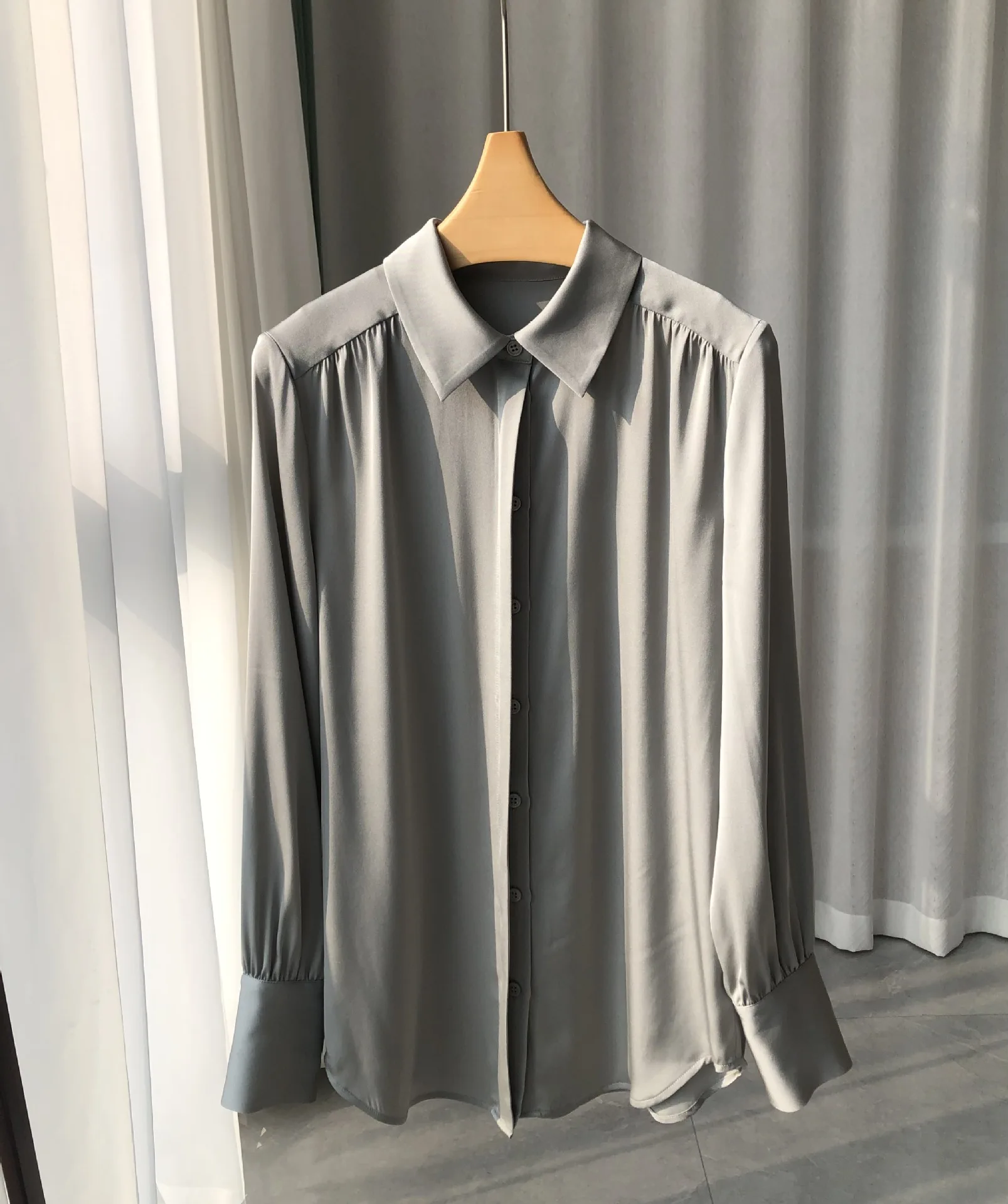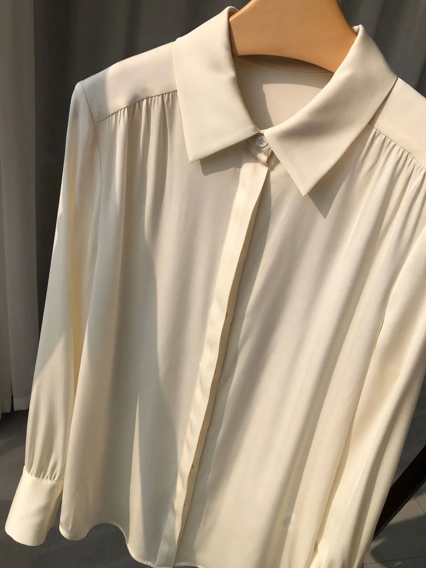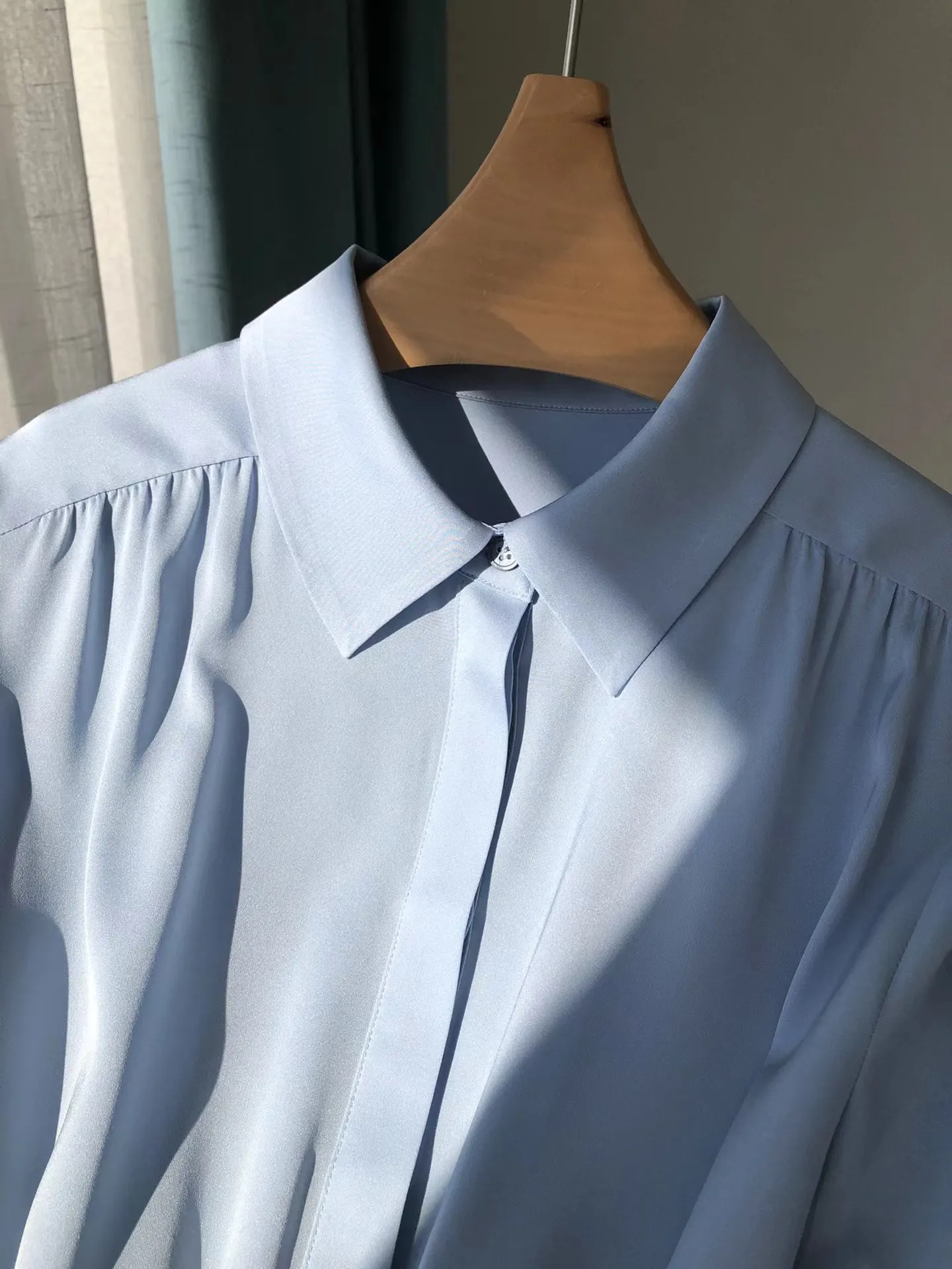 Elegant and Simple Smooth Double Joe Satin Pleated Silk Shirt Elegant Restrained Womens Silk Blouse Mulberry Silk Shirt