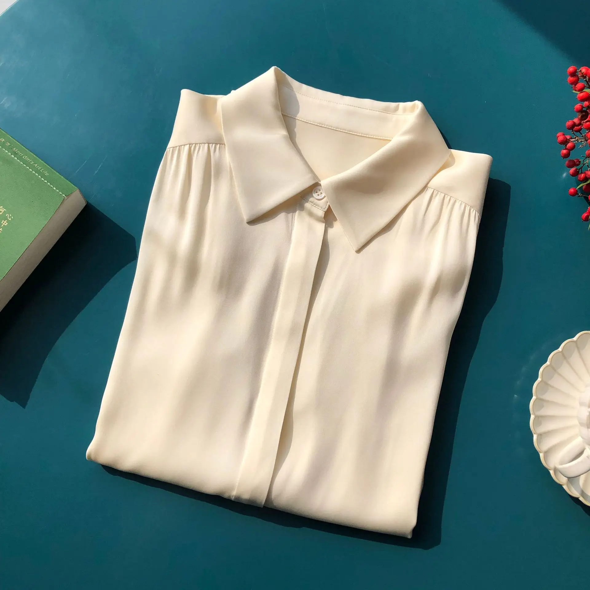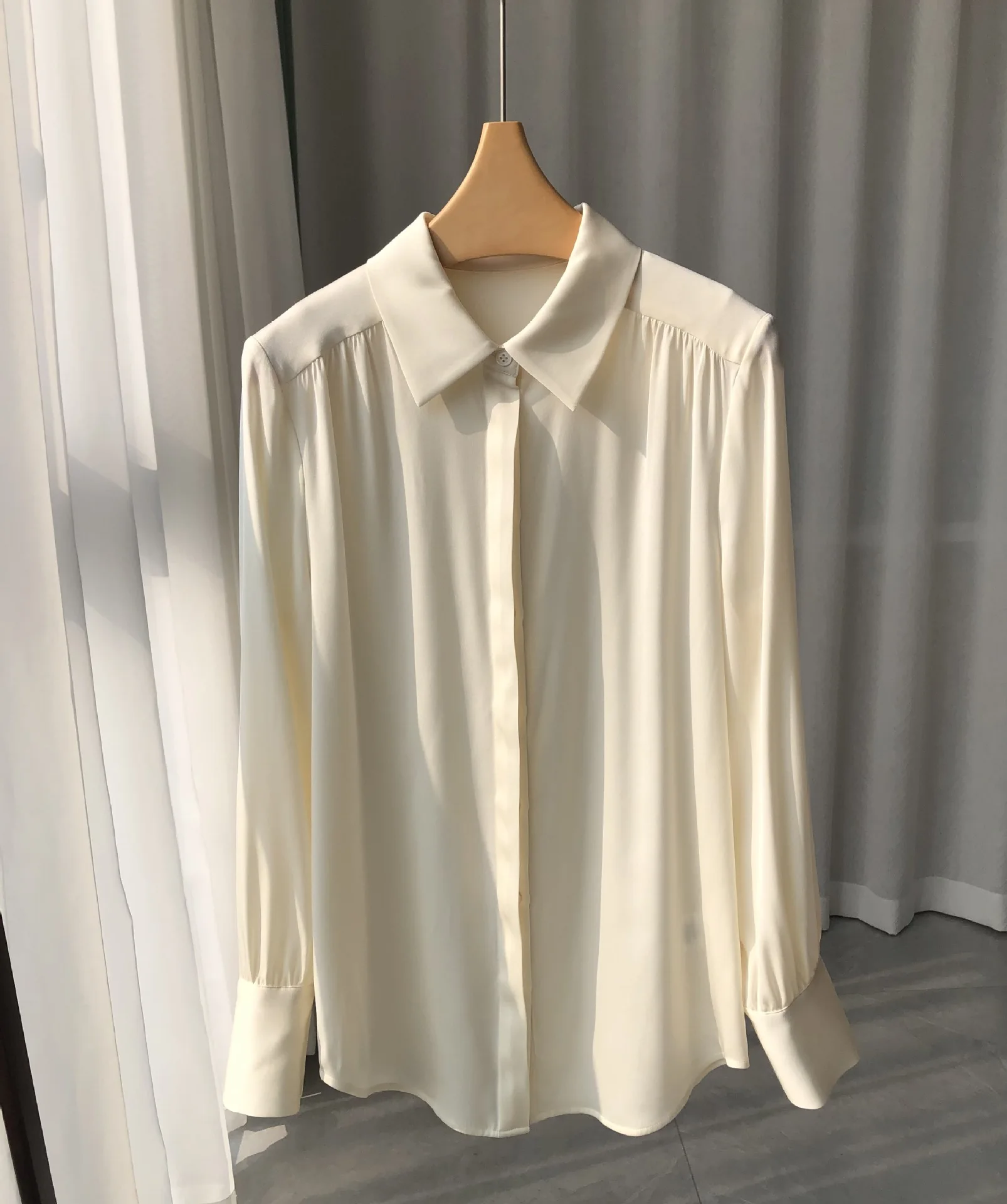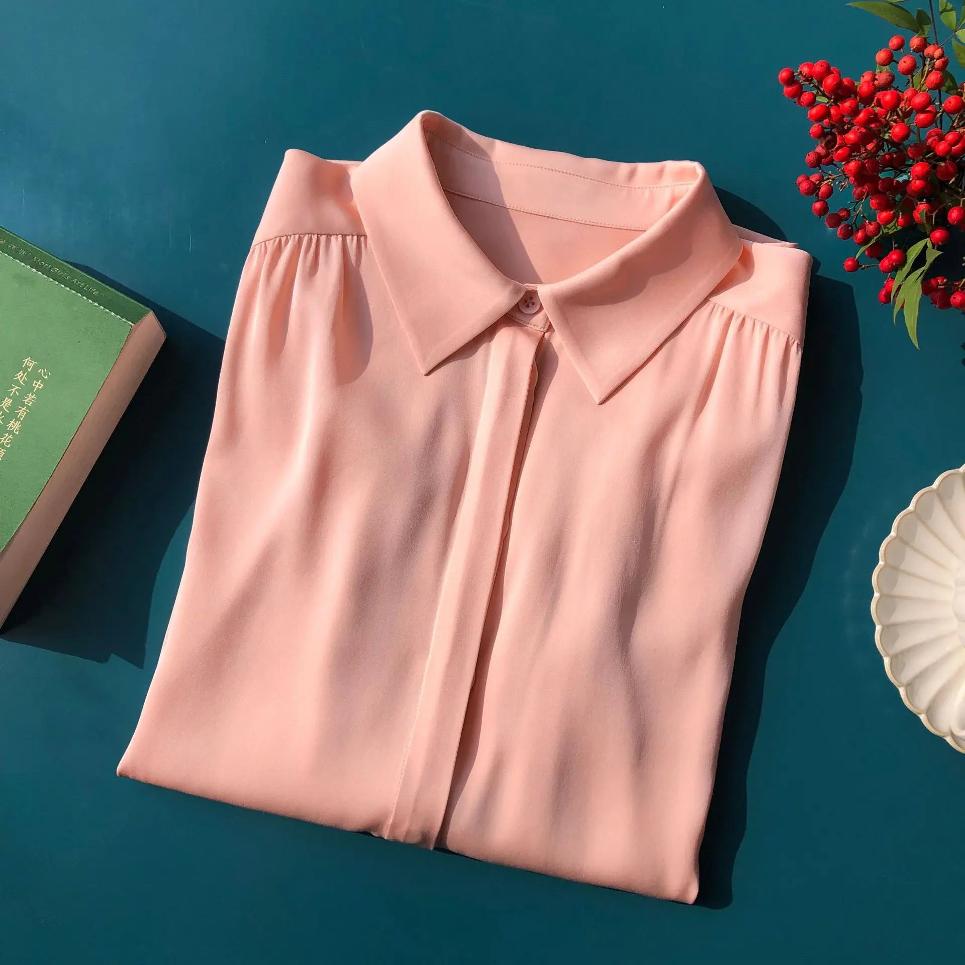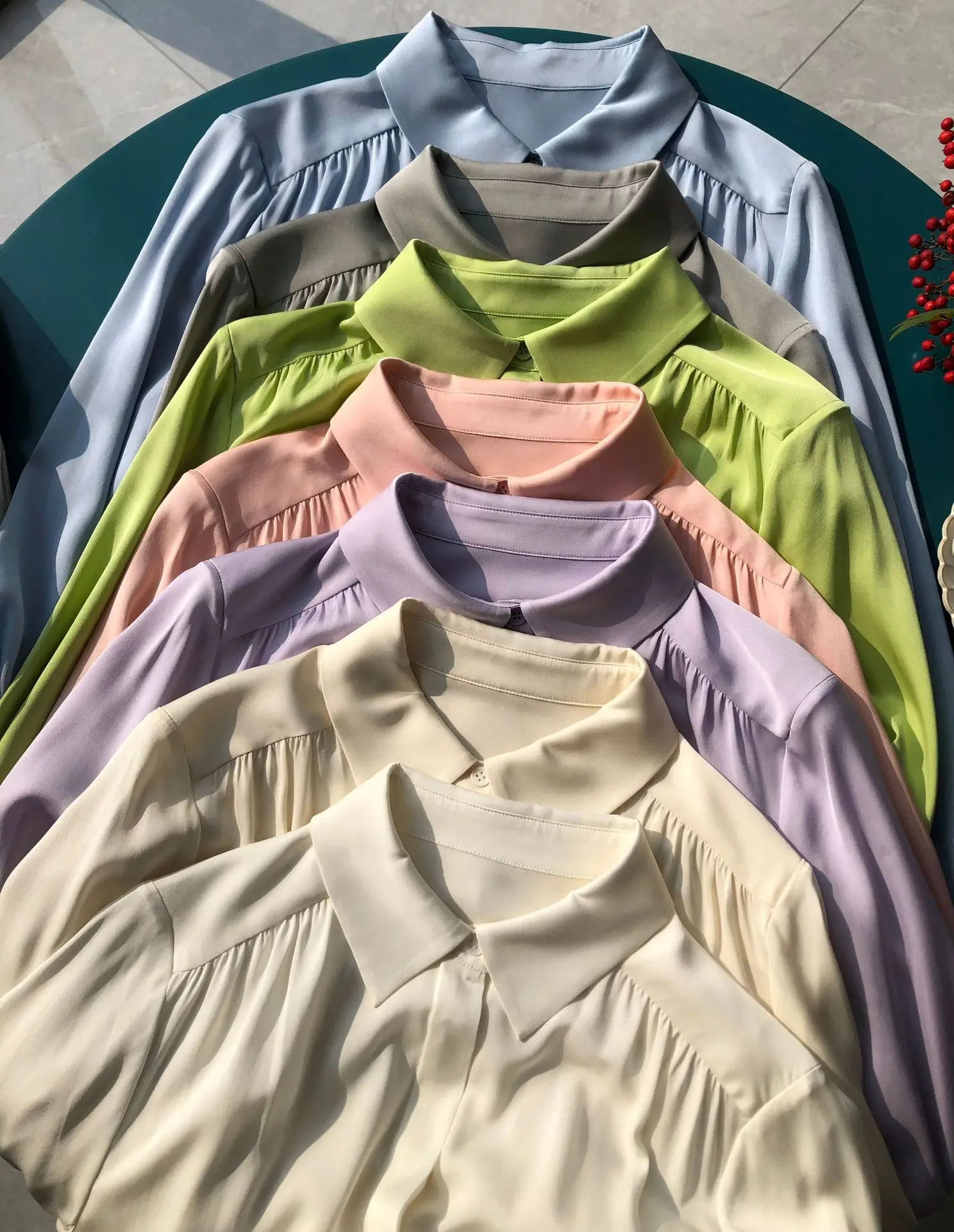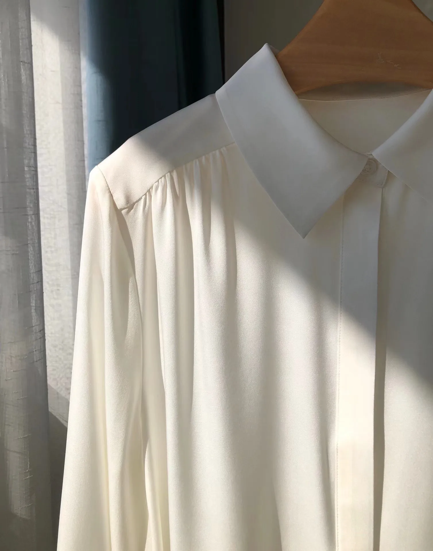 Elegant and Simple Smooth Double Joe Satin Pleated Silk Shirt Elegant Restrained Womens Silk Blouse Mulberry Silk Shirt