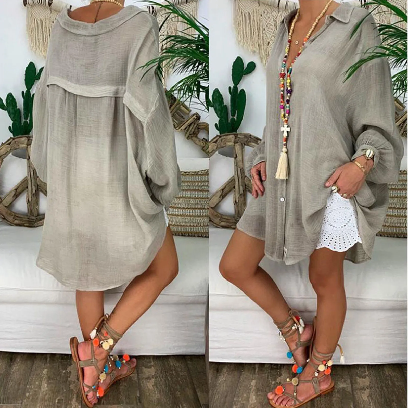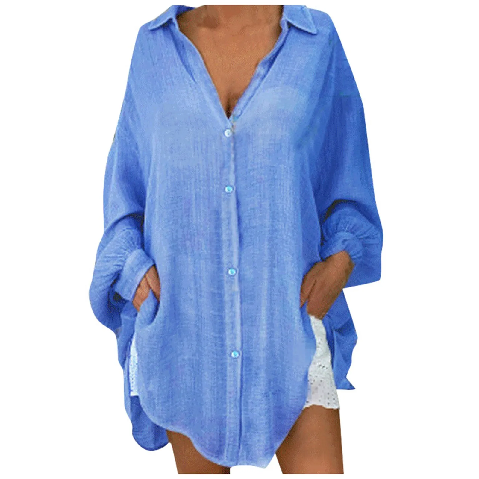 Loose Linen Shirts for Women Solid Color Cotton Linen Bohomian Style Long Sleeve Loose Casual Blouse Lapel Neck Large Size Shirt